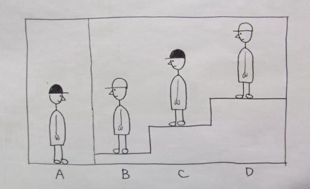 자, 그럼 C 의 입장에서 생각해 보자. D 가 아무런 대답을 못하고 있으므로 자신의 모자 색과 B 의 모자색이 다르다는 것을 생각할 테고, C는 B의 모자색을 보았으므로 자신의 모자색을 알게 되는 것이다.